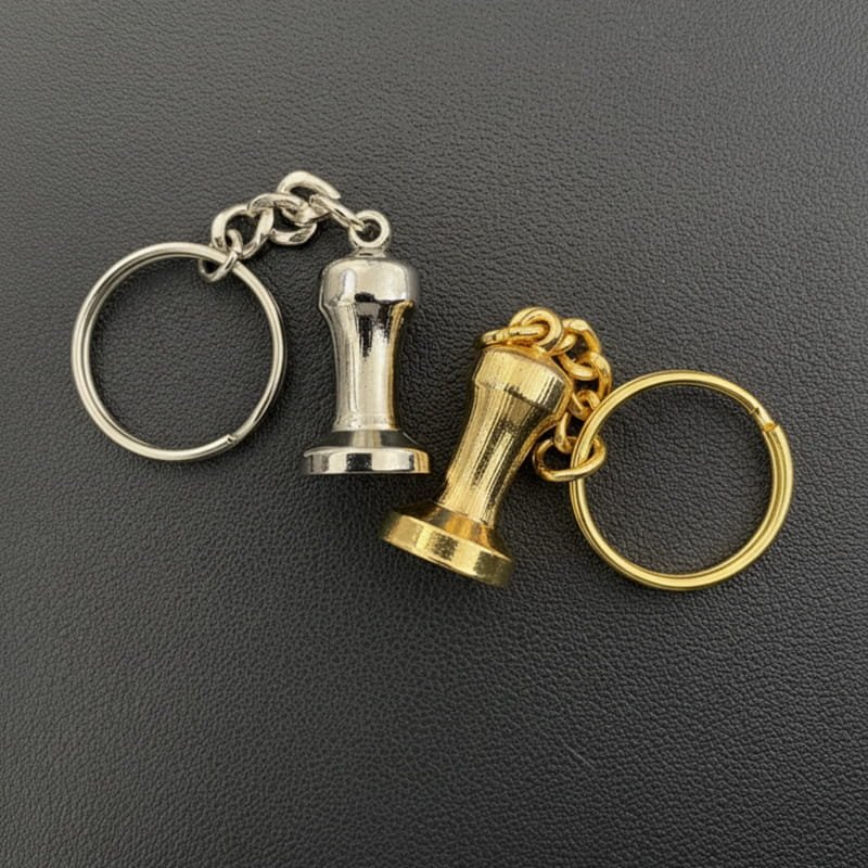 A miniature Tamper Keyring in gold or chrome finish — the essential barista tool, now in pocket size. Stylish, durable, and perfect for anyone in the coffee trade.